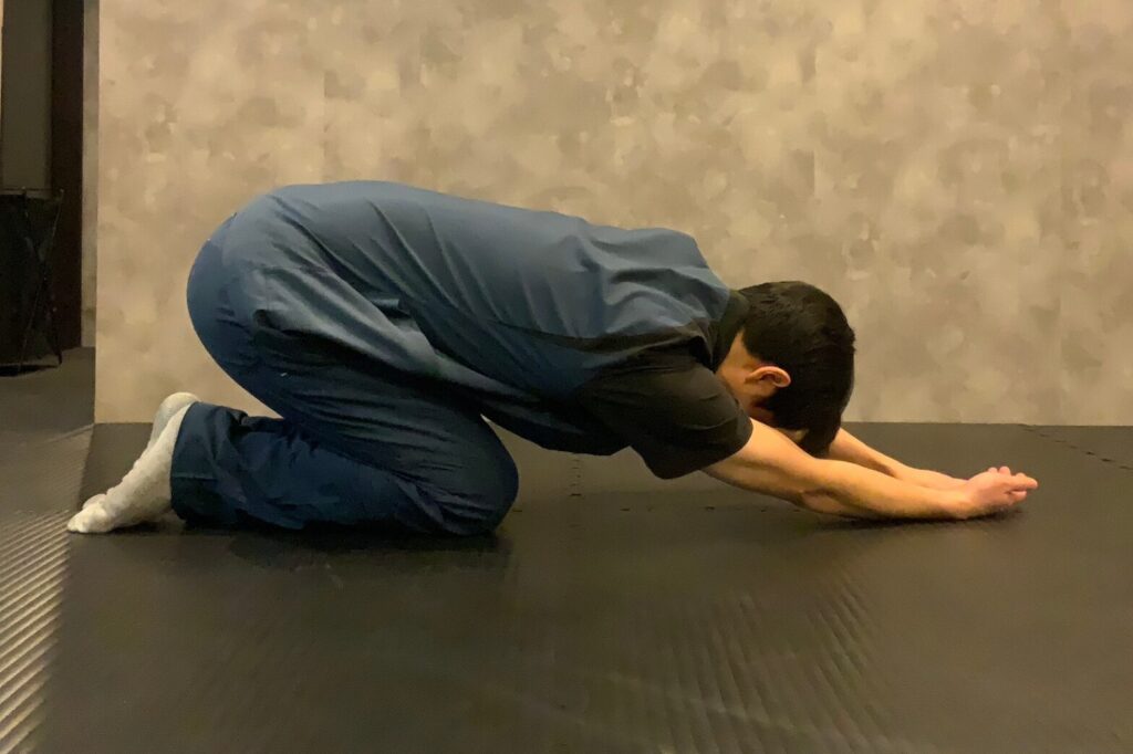 - お尻をかかとの方へ引きながら、胸を床に近づけ、脇の下から背中を伸ばします。
