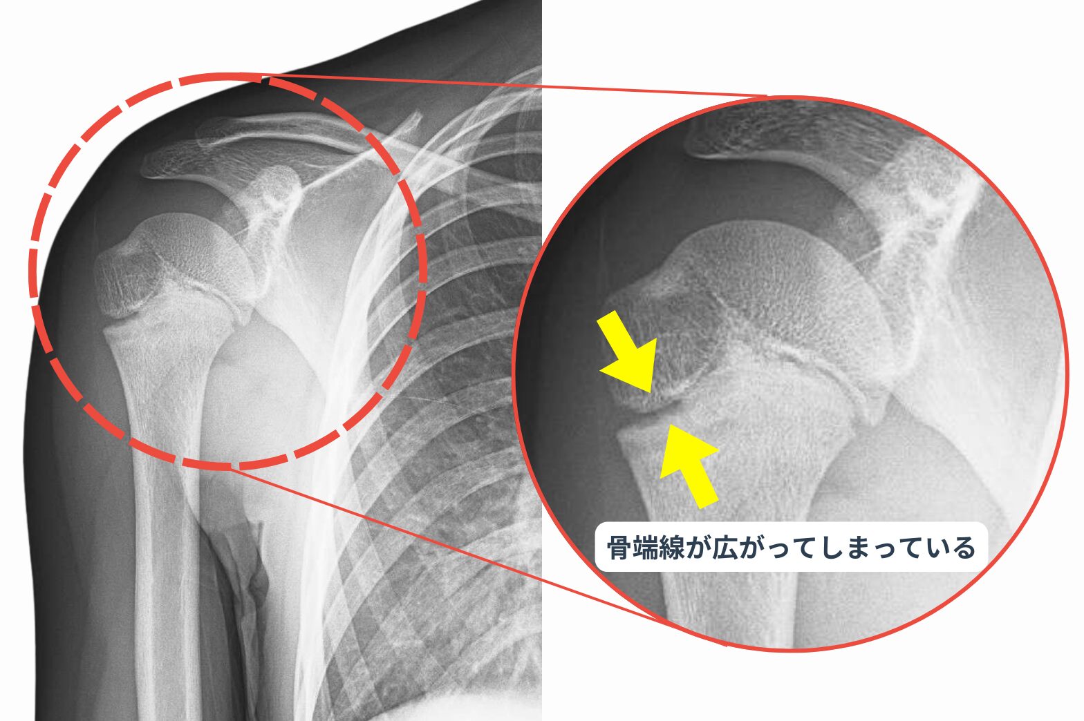 👉 リトルリーガーズショルダー(上腕骨近位骨端線離開)です。