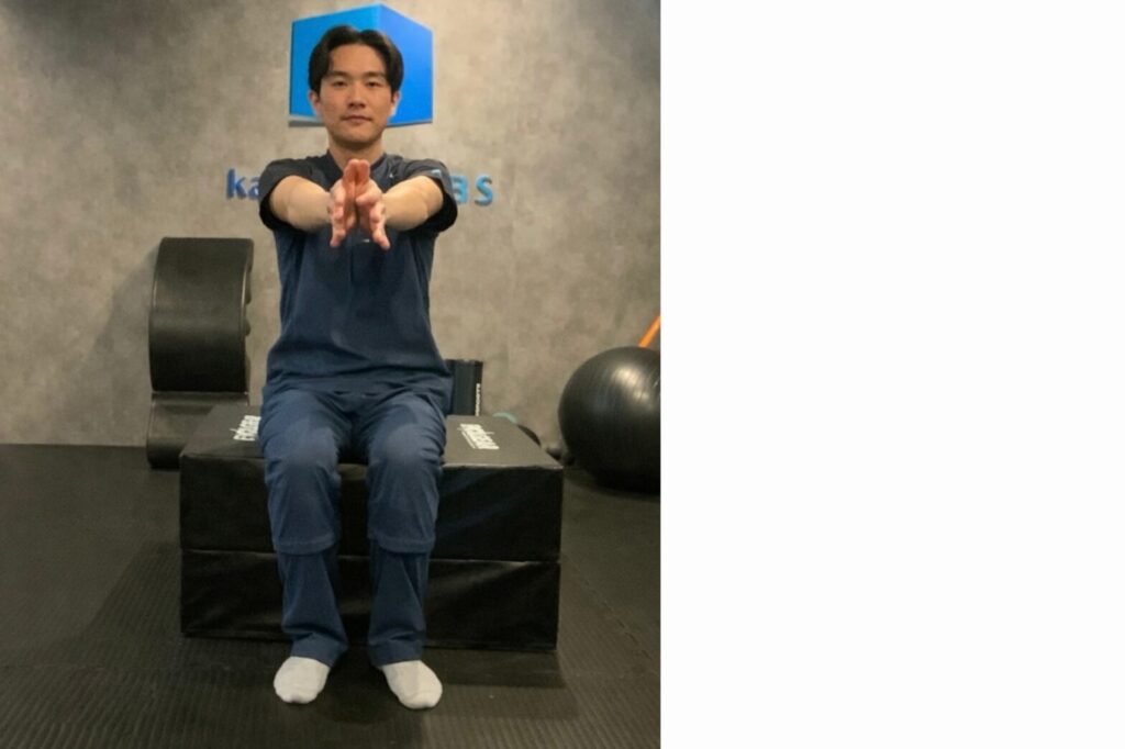 両腕を腕の前に置いてしゃがみます。踵を上げずに、座ることができるかどうかを確認しましょう。