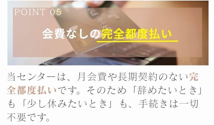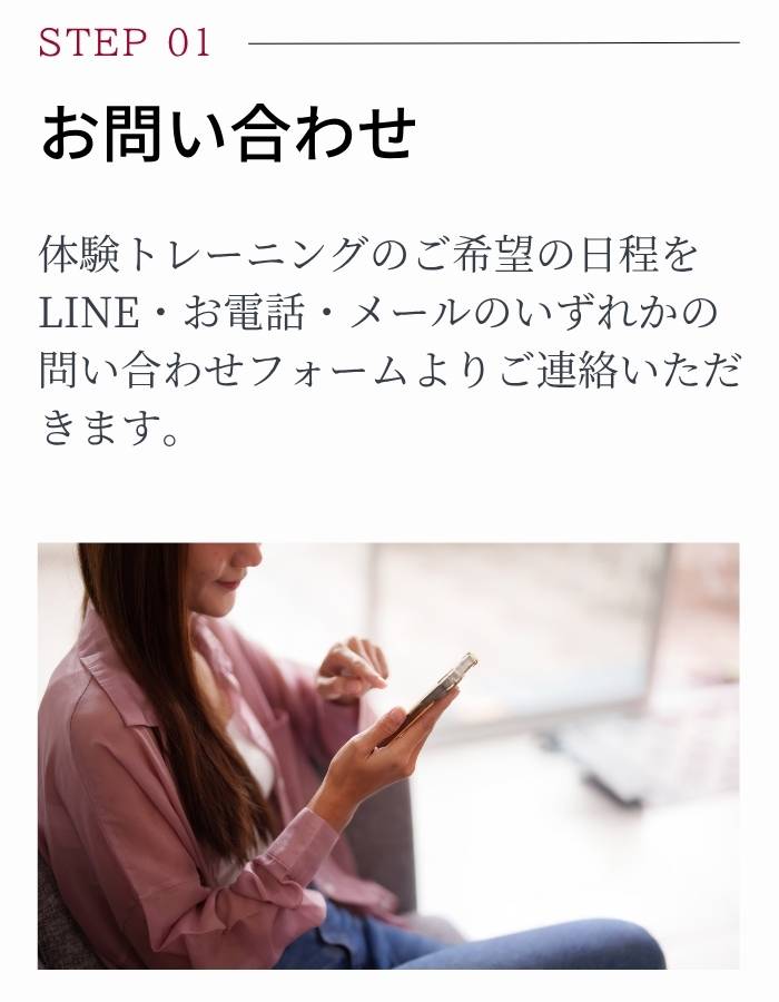 ご負担なく、ご自分のペースで通っていただけます。お客様が必要なときにだけ利用できるシンプルな仕組みなので、忙しい方でも無理なく続けられます。ほかのジムやパーソナルトレーニングとの併用も歓迎です。いつ来ていただいても、しっかり効果を感じてもらえるように、私たちトレーナーは「効果」にコミットして、ご評価いただけますよう全力を尽くします。