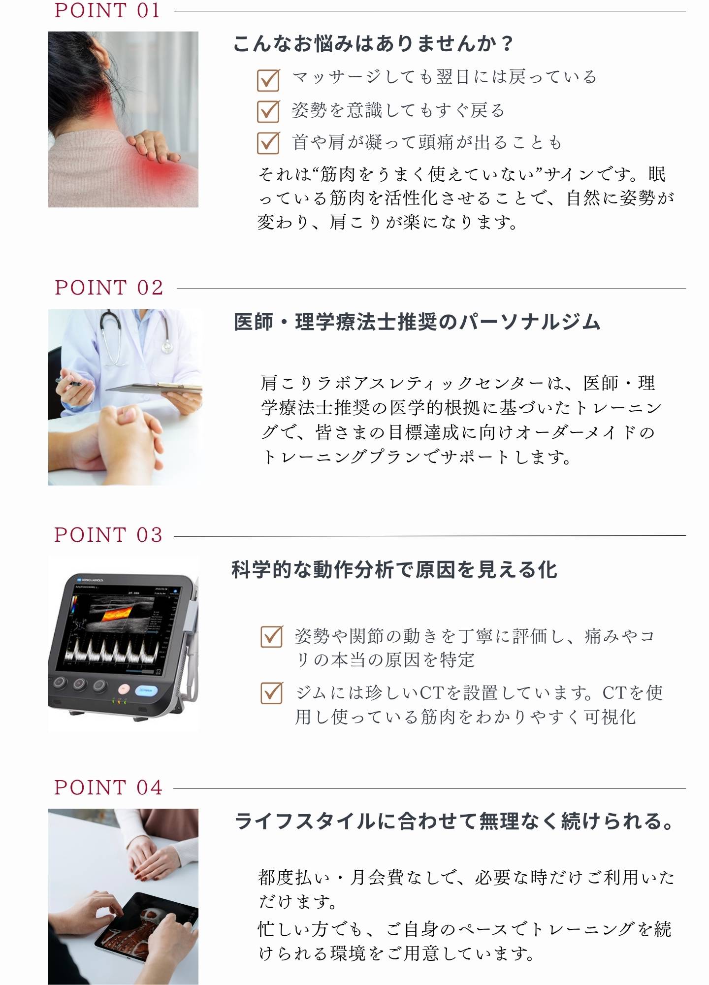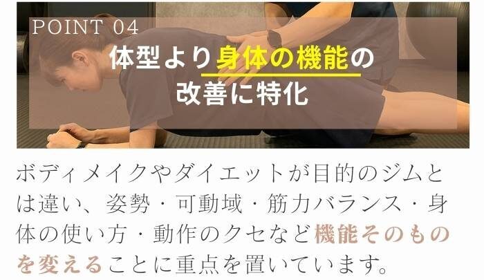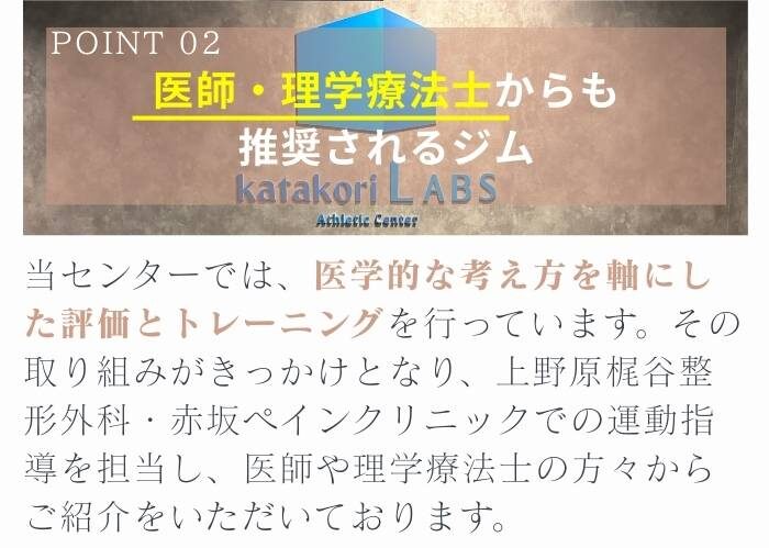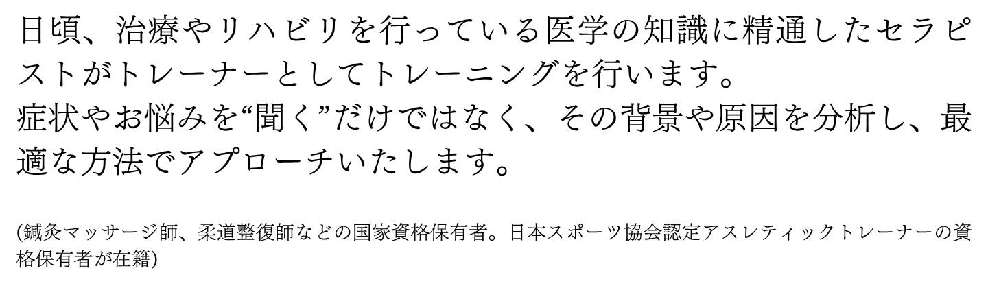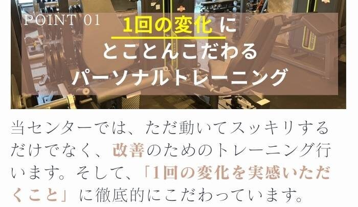ただきついハード運動ではなく、改善のために効果がある運動をご提供します。アスリートや運動愛好家だけでなく、運動初心者や体力に自信がない方、基礎疾患をお持ちの方が多数ご利用いただいております。