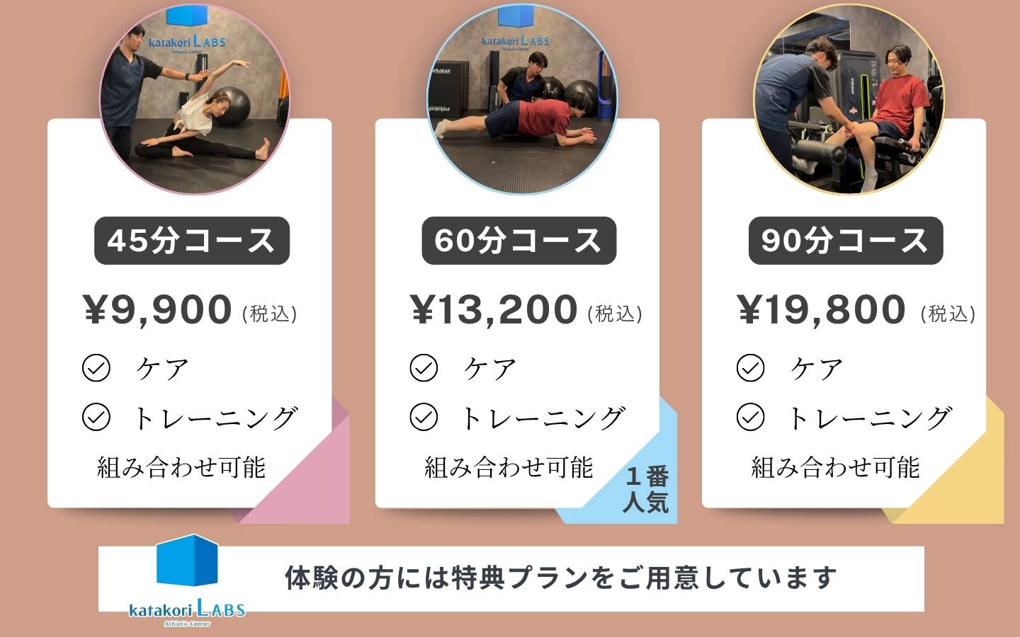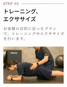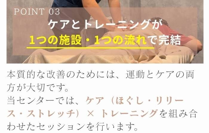 身体が固い日はケアで「動ける状態」に整えてから運動。しっかり動いたあとに、仕上げにケアで疲労回復。すべて同じ施設・ひと続きの流れで行えるから、ムダがなく効果が出るのも早いです。お客様のその時の身体の状態やご要望に合わせて、最適な順番と内容に、その都度カスタムします。