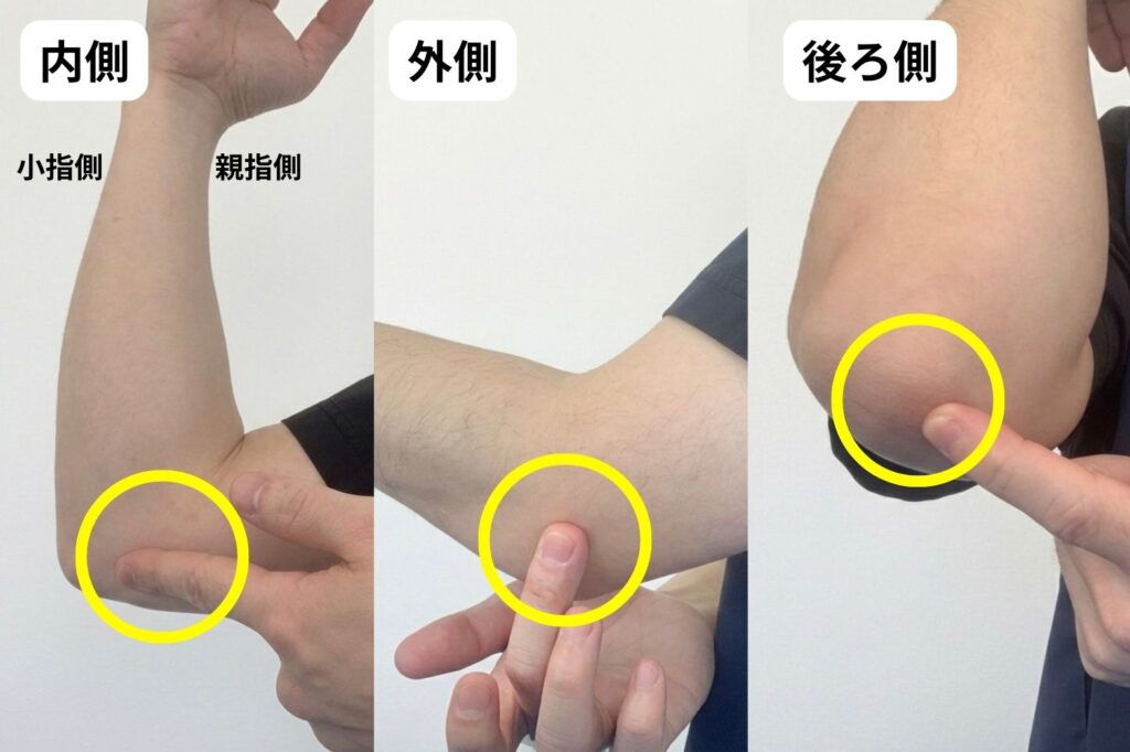 肘(内・外・後ろ側)を押して痛みがないか確認します。