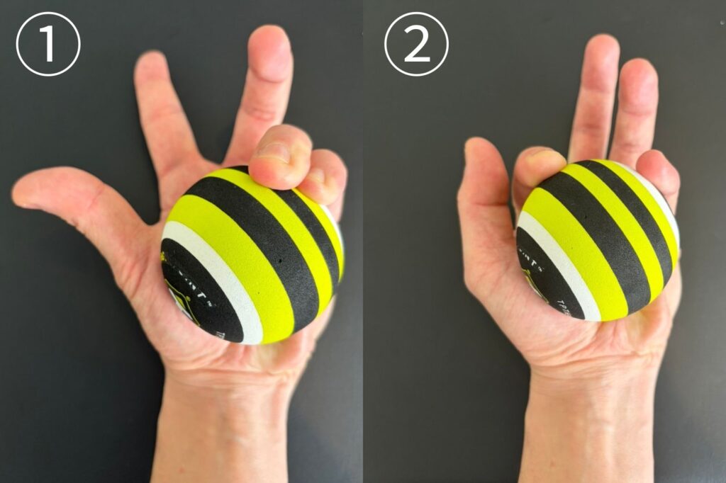 前腕を台に乗せて、ボール(スポンジなどでも代用可能)を握り、ボールを軽く潰します。(薬指・小指、人差し指・小指に2パターンで行います。)